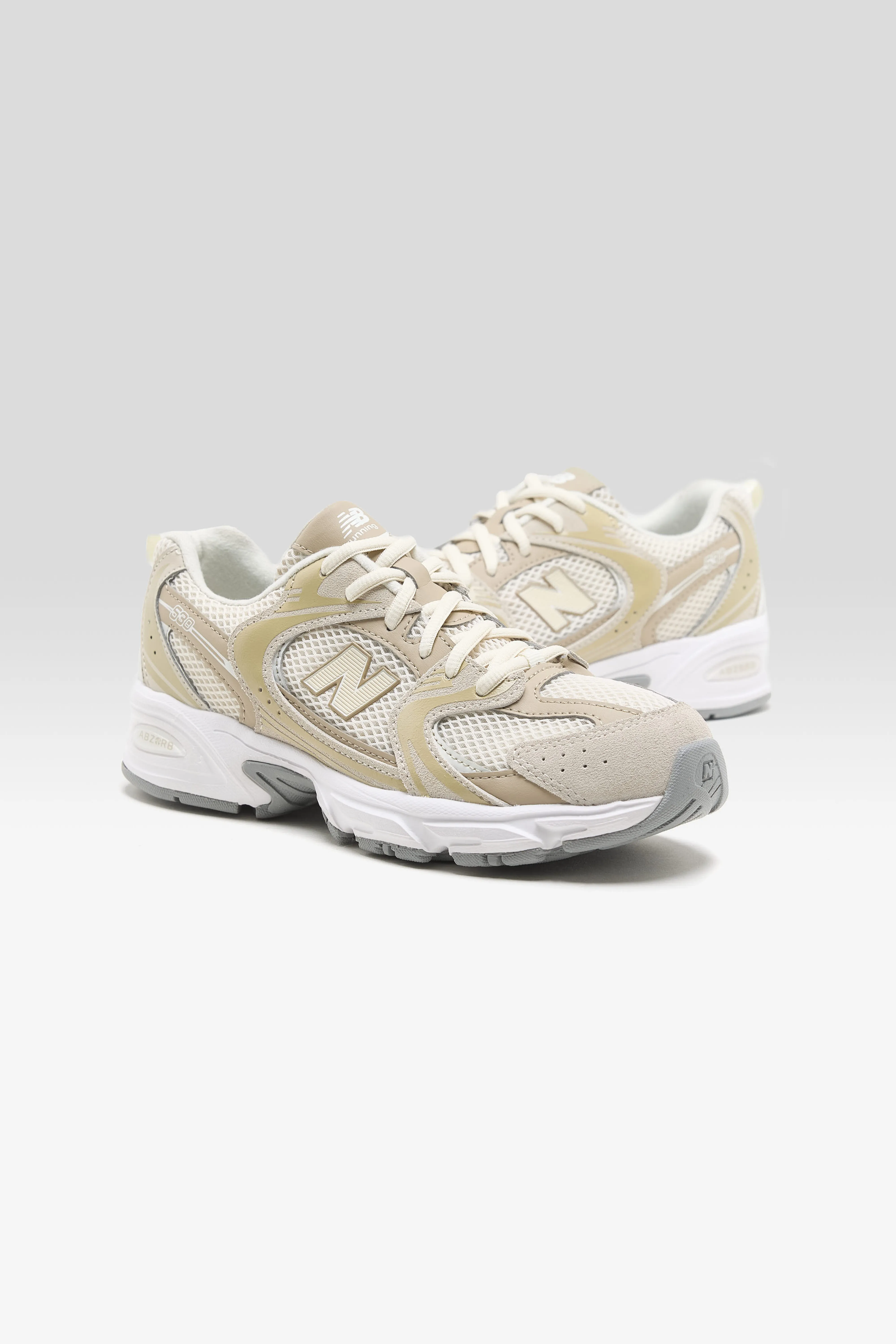 The New Balance 530 everyday sneakers feature a mesh upper with synthetic leather overlays and cushion details.
