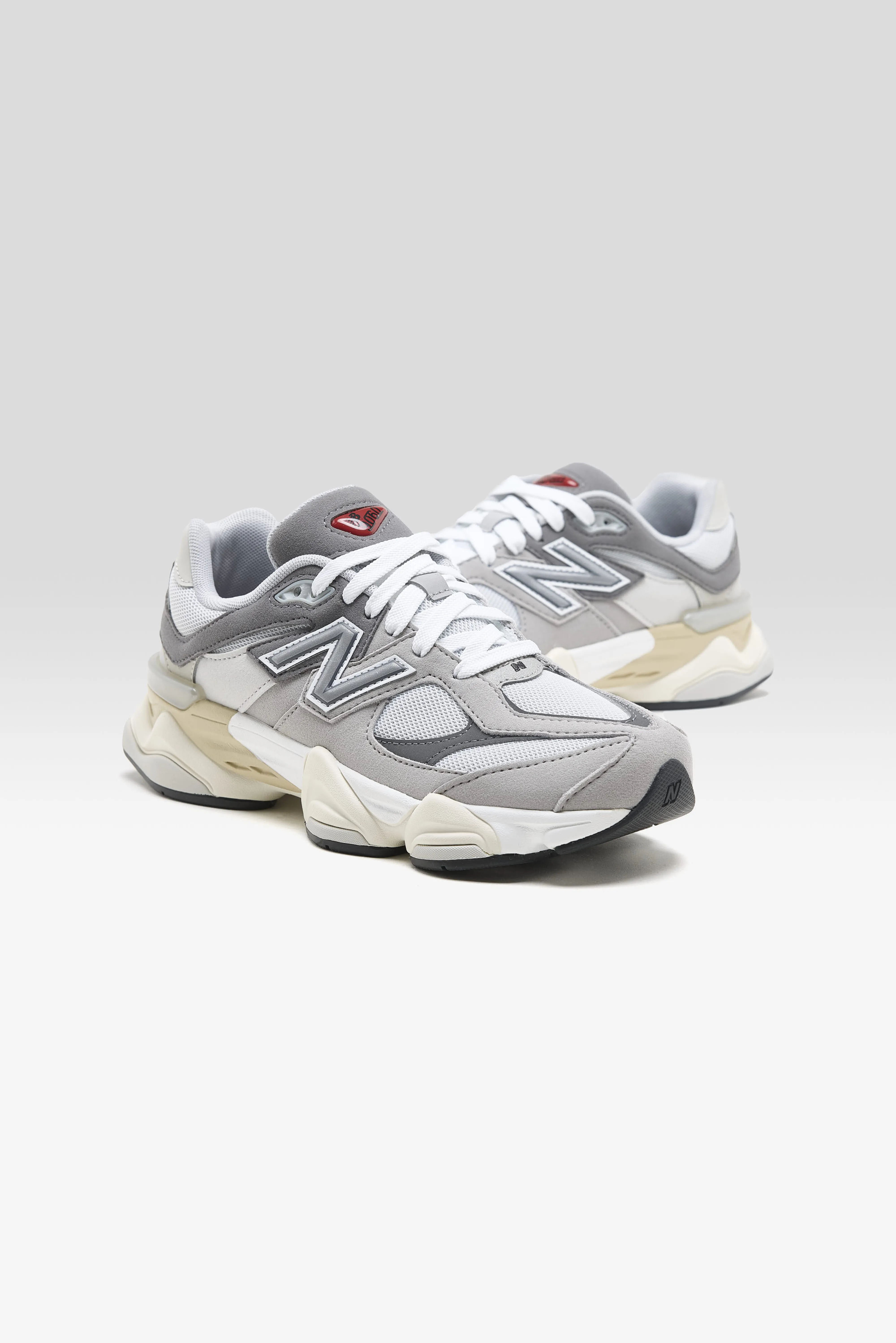 The New Balance 9060 junior sneakers feature a mesh upper with synthetic leather panels, ABZORB and SBS cushioning, and a translucent CR device on the heel.