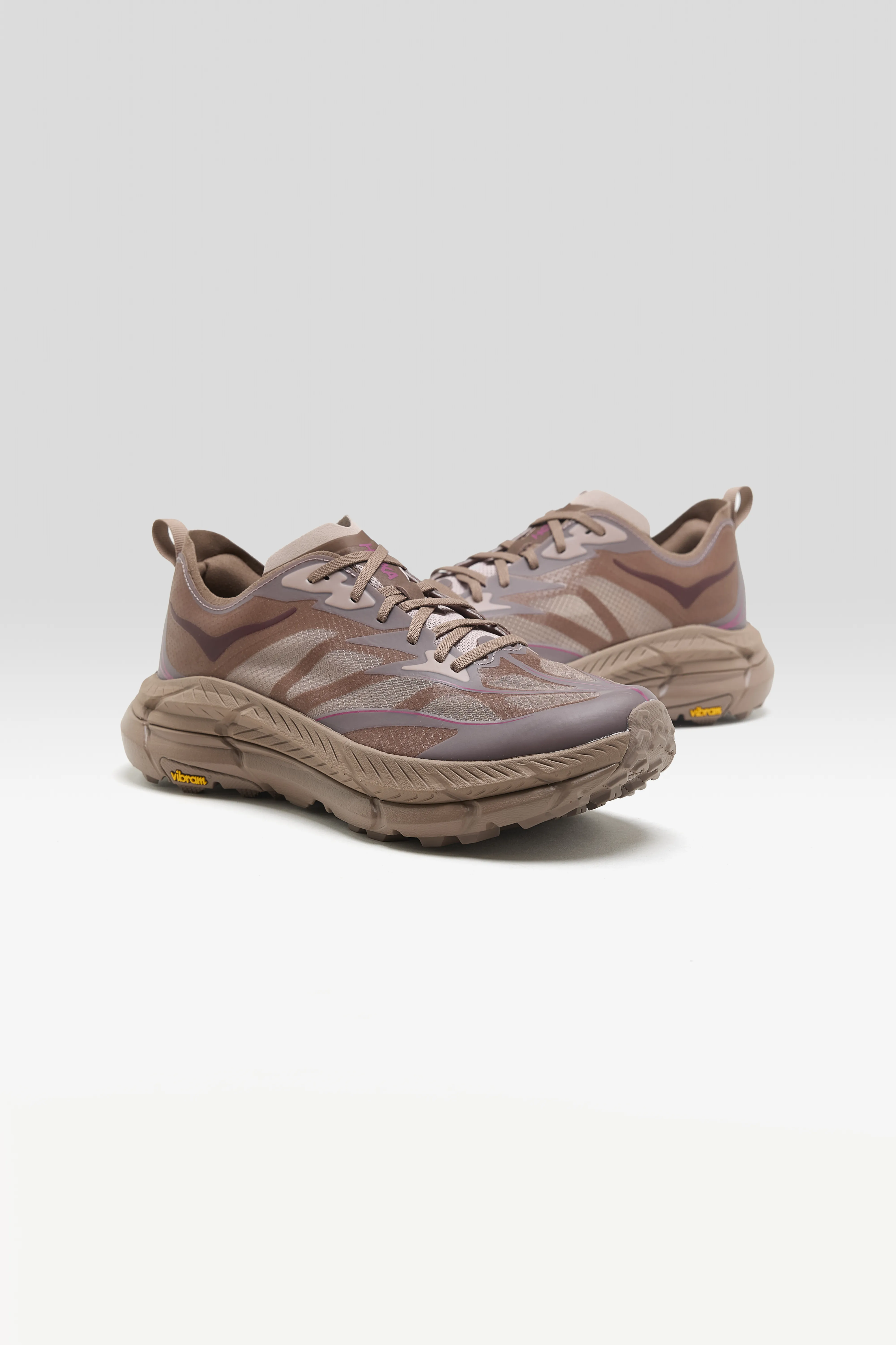 The Hoka Mafate Speed 4 Lite lifestyle sneakers feature an ultralight, transparent ripstop nylon upper with a ProFly EVA midsole, Vibram Megagrip traction rubber outsole, and a soft microfibre collar.