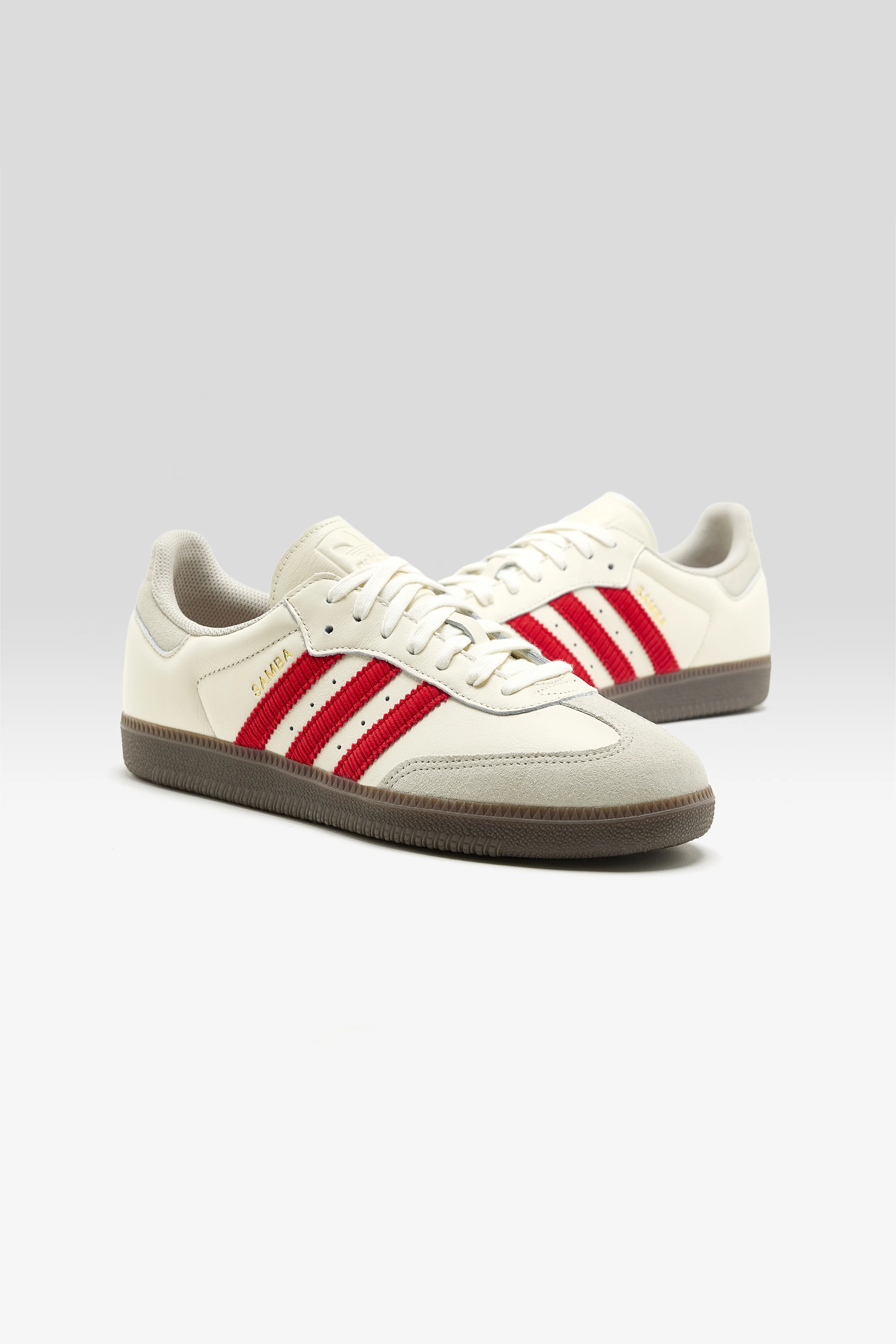 The Samba OG sneakers feature a soft, tumbled leather upper with a nubuck T-toe and leather stripes in a cold cement construction.
