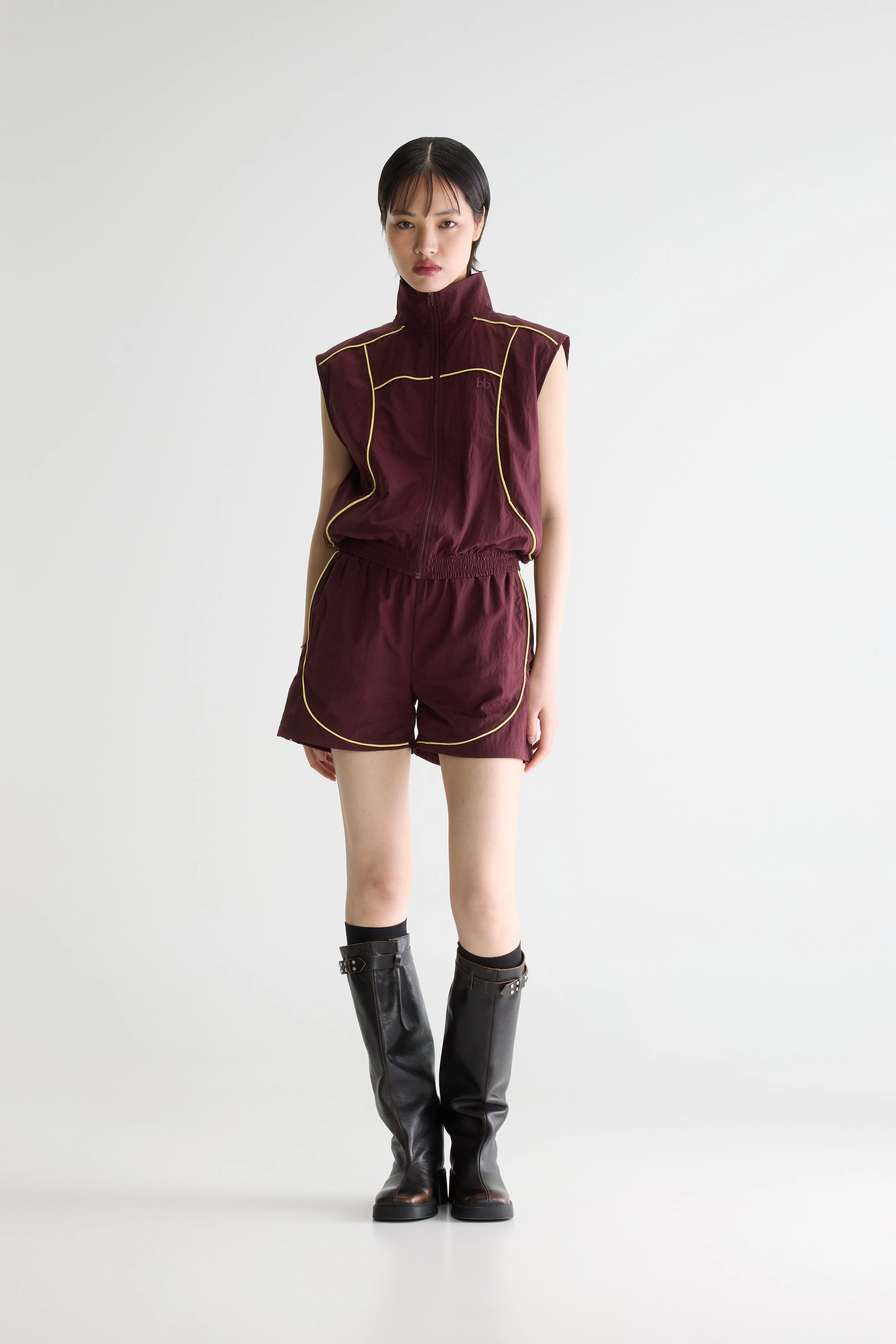 Burgundy sleeveless nylon sports vest with contrasting yellow piping and curved hems.