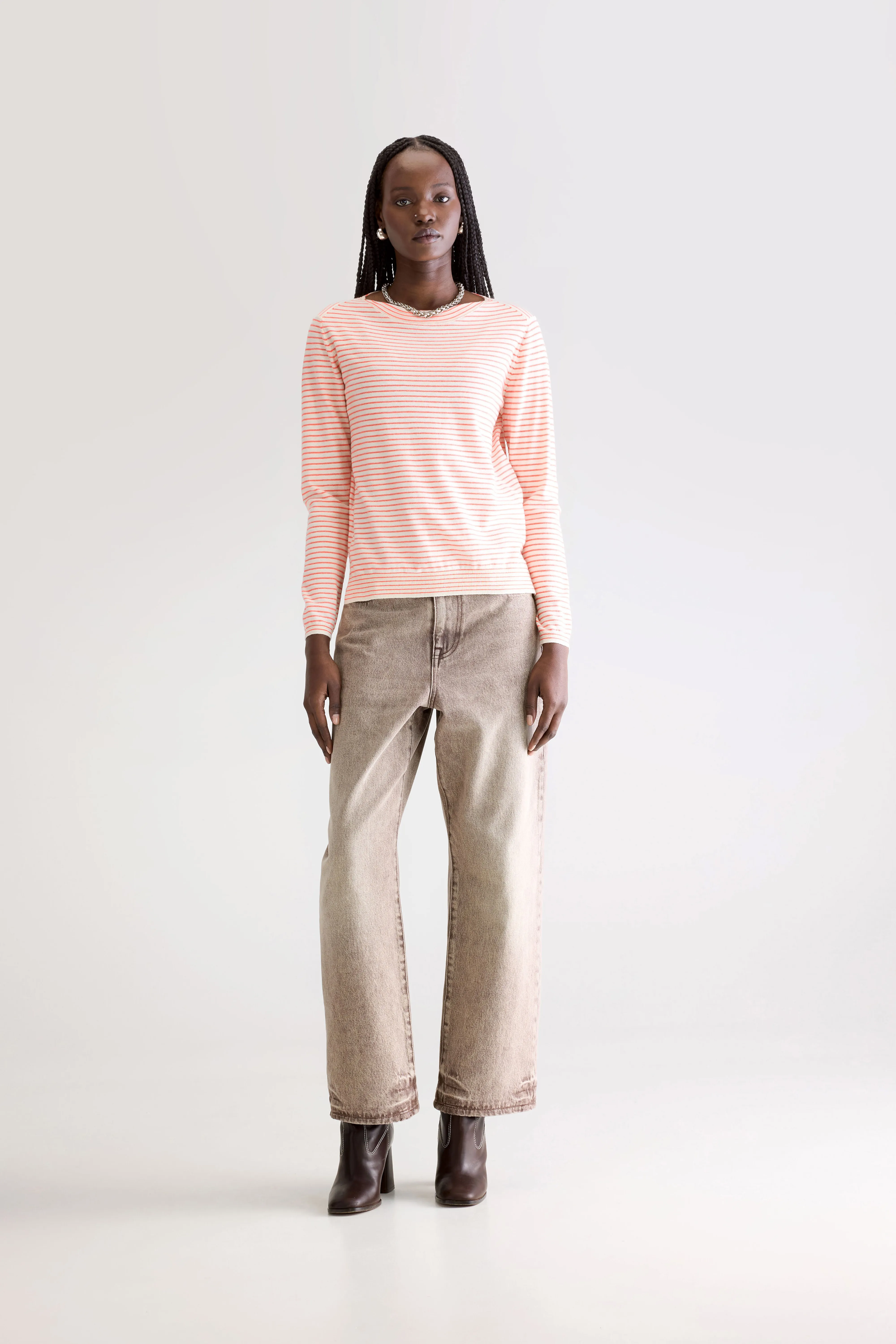 Ecru boatneck sweater with fluo pink stripes.
